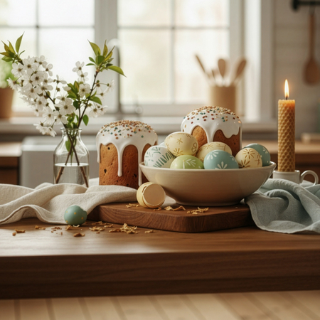 Традиционные сладости, свежие ингредиенты для выпечки и украшения стола.