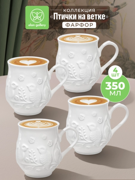 Набор 4 кружек от бренда Elan Gallery "Птички на ветке" выполнен из белого фарфора. Размер каждого фарфорового изделия 11,5х9х9,5 см, объём – 350 мл. Посуда украшена изящным рельефным узором. Кружечки с рельефом помогут провести множество приятных завтраков с капучино или латте, а также уютных чайных вечеров с любимым горячим напитком. Белые бокалы подходят ценителям чая и кофе, которые любят пить из красивой посуды. Фарфоровое изделие отлично подойдёт как для молока, так свежевыжатого сока и морса. Фарфор в отличие от керамики быстро отмываются и не впитывает цвет напитков. Кружки украсят интерьер вашей кухни, столовой и привнесут эстетики в повседневные моменты. Подойдут для кофейных перерывов на работе в офисе. Кружки в едином стиле можно использовать всей семьей или для приёма гостей. Не рекомендуется применять абразивные моющие средства. Беречь от резких перепадов температур и механических повреждений. Подходят для посудомоечной машины и микроволновой печи. Комплект поставляется в стильной картонной коробке. Вам не придётся искать дополнительную подарочную упаковку, чтобы сделать сюрприз близким на праздник. Красивая посуда – хороший вариант для подарка. В коллекции бренда Элан Галерея можно найти много красивого кухонного и столового инвентаря, а также собрать чайный набор на свой вкус.