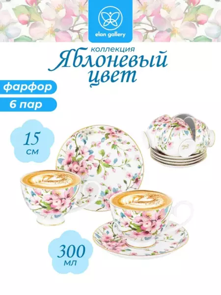 Чайный набор серии "Яблоневый цвет на белом" состоит из 6-ти чайных пар: 6-ти чашек объемом по 300 мл и 6-ти блюдец диаметром по 15 см. Чайный набор поможет провести множество приятных чаепитий. Чайные пары украшены розовыми цветами яблони на белом фоне и обрамлены золотым окаймлением. Выполнены из высококачественного фарфора New Bone China. Это фарфор нового поколения, не уступающий по качеству традиционному костяному фарфору, но при этом гораздо более экологичный в производстве. Посуда с золотым окаймлением не подходит для использования в микроволновой печи и посудомоечной машине. Поставляется в подарочной упаковке. Чайный набор из серии посуды "Яблоневый цвет на белом" сможет стать настоящим украшением кухни или приятным подарком для ваших родных и близких!