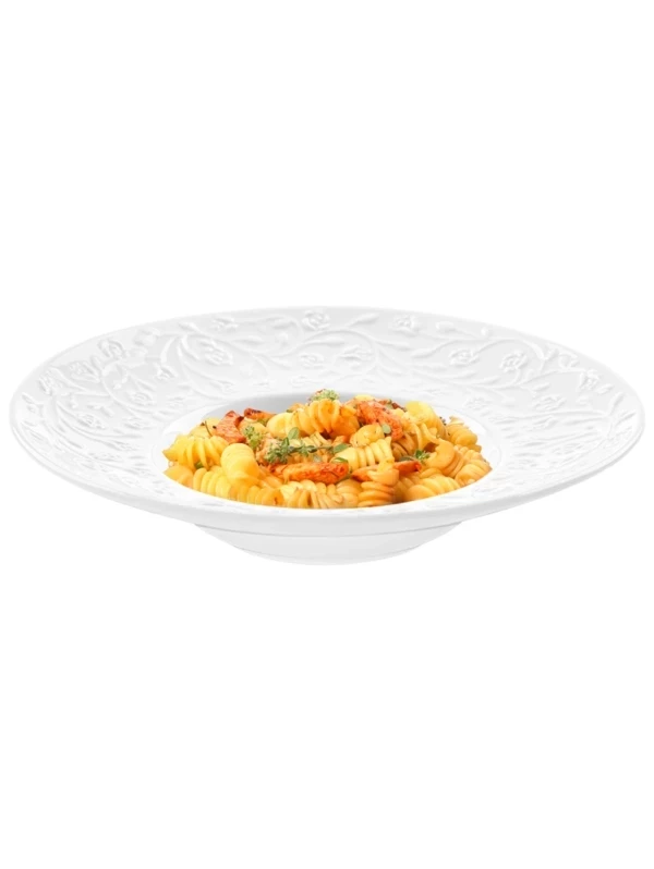 Тарелка Elan Gallery "Веточки-цветочки" размером 25х25х5,5 см выполнена из белого фарфора. Посуда серии украшена рельефным узором в виде изящных веточек с маленькими цветочками. Глубокая круглая тарелочка подойдёт для подачи супов, бульонов и каш. Эргономичная форма посуды позволяет использовать её также для любых блюд: рагу, салатов, пасты. Блюдо подойдёт для сервировки как на праздник, так и в будни. Не рекомендуется применять абразивные моющие средства. Можно использовать в микроволновой печи и мыть в посудомоечной машине. Поставляется в картонной упаковке. Эта тарелка станет отличным подарком для любой хозяйки, которая ценит стильную сервировку. Понравится любителям посуды в скандинавском стиле. Серия «Веточки-цветочки» позволит собрать сервиз в едином стиле и сможет стать настоящим украшением вашего дома.