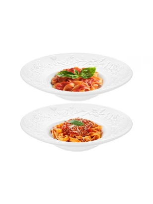 Набор 2 круглых тарелок из серии «Ажур» предназначен для эстетичной сервировки вашего стола. Размер каждого изделия – 27х27х2 см. Выполнены из фарфора нового поколения new bone china, сочетающего в себе изящность и высокую прочность. За счёт гладкости изделия легко отмываются, поэтому блюда сохраняют привлекательный вид и практичны в использовании. Плотная структура материала позволяет посуде дольше сохранять температуру блюд и напитков. От других видов костяного фарфора new bone china отличается большей экологичностью в производстве. Кайма каждого блюдца украшена изящным рельефным узором. Сервировочный набор из больших обеденных тарелок отлично подойдёт для подачи вторых блюд, салатов и закусок. Заполните их пастой и деликатесами из рыбы, красиво выложите нарезку из свежих овощей и фруктов, сыров и яиц. Положите роллы или суши для вкусного перекуса. Изделия помогут красиво преподнести разнообразные десерты, сладости или выпечку. Разложите конфеты, разместите по кусочку торта на дружеском или семейном чаепитии. Лаконичные изделия впишутся в интерьер любой кухни и столовой. Не рекомендуется применять абразивные моющие средства. Подходят для использования в посудомоечной машине и микроволновой печи. Поставляется в дизайнерской картонной коробке – благодаря ей вам не потребуется дополнительная подарочная упаковка. Фарфоровая сервировочная посуда станет оригинальным подарком для хозяйки, ценящей не только практичность, но и привлекательность. Серия «Ажур» станет украшением любого кухонного инвентаря и позволит собрать сервиз в едином стиле!