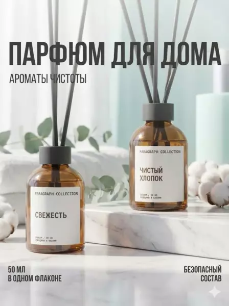 Флаконы выполнены из стекла премиального качества — они подчёркивают чистоту ароматов и гармонию коллекции. Простая форма и кристальная ясность материала делают их эстетичным элементом интерьера: современным, лаконичным и изысканным одновременно. Каждый аромадиффузор с палочками создан на основе французских отдушек, не содержит альдегидов и полностью безопасен для использования в доме. Белые палочки подчеркивают светлую палитру ароматов, добавляя ощущение свежести и утончённости.