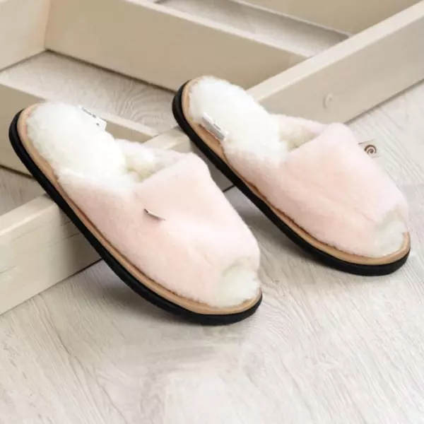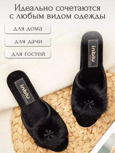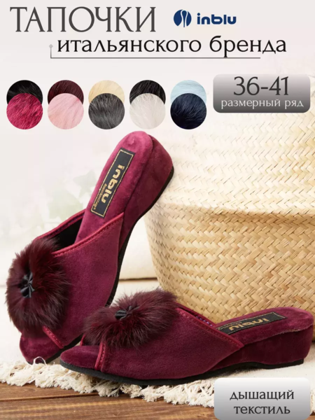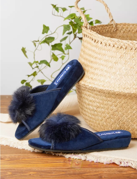 женские, домашние тапочки INBLU RR-1X синего цвета с меховым помпоном, открытым мыском, продольным супинатором и на высокой танкетке (4см).