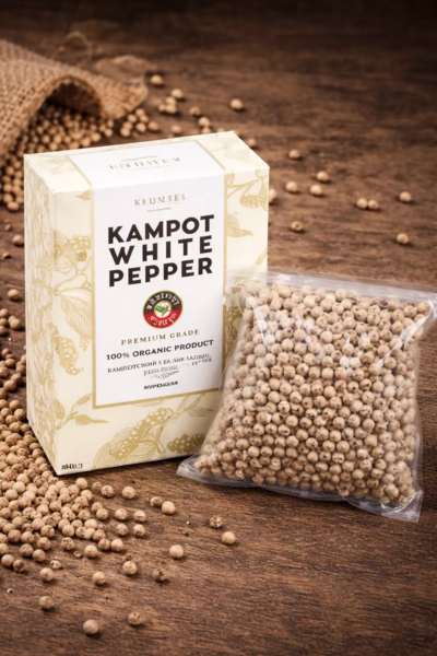Кампотский белый перец (премиальное качество) менее острый, чем черный перец обладает изысканным вкусом и тонким ароматом с нотами свежих трав и цитруса. Кампотский белый перец не стоит путать с белым перцем из Вьетнама, Индии и других стран. Оригинальный кампотский белый перец не имеет "тяжелого" специфического аромата. Идеально использовать для рыбы и морепродуктов, телятины и свинины, птицы, салатов, омлета. Свежий помол - это лучший способ раскрыть все грани вкуса кампотского перца. Белый перец – получают из желтых и оранжевых ягод, которые несколько дней вымачивают в воде, затем удаляют кожуру и высушивают на солнце, перец приобретает светло-бежевый оттенок.