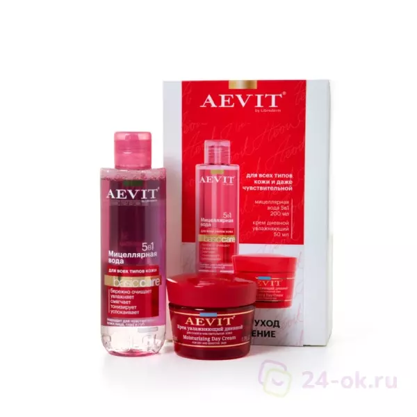 AEVIT крем увлажняющий дневной 50 мл. Активные ингредиенты [+] 3D увлажняющий комплекс способствует восстановлению барьерных функций кожи, уменьшая трансэпидермальную потерю влаги, улучшает микроциркуляцию воды в коже, стимулирует синтез собственной гиалуроновой кислоты и натурального увлажняющего фактора. [+] Церамиды являются важным компонентом клеточной мембраны, выступают в качестве сигнальных молекул, активно участвуя в биохимических процессах кожи. [+] Sodium PCA – эффективный природный увлажнитель, обеспечивает кожу влагой, увеличивает эластичность, повышает защитные функции кожи. [+] Витамины А и Е эффективно увлажняют, ускоряют процессы регенерации, обеспечивают антиоксидантное воздействие. Миндальное и кунжутное масла интенсивно питают и смягчают, препятствуют испарению влаги. Крем легкой текстуры обеспечивает длительное и глубокое увлажнение, питает кожу, нормализует липидный баланс, усиливает естественную защитную функцию кожи, придает мягкость и ощущение комфорта. Ваша кожа ухоженная, нежная, гладкая и увлажненная на весь день. Не содержит парабенов и красителей. Является прекрасной основой под макияж. AEVIT мицеллярная вода BASIC CARE 5 в1 для всех типов кожи 200 мл: [+] Содержит активный увлажняющий комплекс, поддерживающий тонус и упругость кожи. [+] Формула обогащена витаминами А и Е, которые смягчают, успокаивают и питают кожу. Бережно очищает кожу лица, глаз и губ от загрязнений, эффективно удаляет макияж, не оставляя ощущения стянутости.