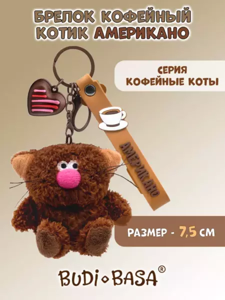 Кот брелок Американо. Брелок сшит из тактильно приятного эко меха коричневого цвета. Усики из шелковистого кручёного шнура. Объемный носик обтянут розовым софтом. Глазки вышиты. На пяточках вшит темно‑коричневый софт, а внутри ушек карамельный софт. Брелок крепится на кольцо шоколадного цвета с силиконовыми подвесами. Один подвес – это браслет с хештегом «вместоЗАРЯДКИ» на кнопке и с фирменным логотипом «Кофейные коты». Другой подвес – шоколадка в виде сердечка с розовыми кремовыми полосками.