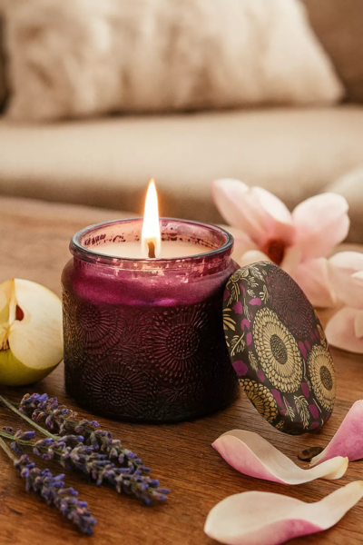 "НЕЖНОСТЬ И РОСКОШЬ" (сочетание нежного аромата лаванды и роскошного магнолии) "ПРАЗДНИЧНАЯ" лимитированная коллекция в маленькой стеклянной банке, вес - 92 гр, время горения - 20 часов, Группы Фруктовые Ноты Яблоко, Лаванда, Мускус, Жасмин, Магнолия Страна Россия Ароматическая свеча «Нежность и роскошь» российской компании Dom Aroma дарит помещению красивый и комфортный свежий цветочный аромат, усиленный теплом живого огня. Все интерьерные ароматы бренда имеют эксклюзивный дизайн, премиальные композиции с натуральным составом, созданные французскими парфюмерами, отличаются прекрасной стойкостью и многогранным звучанием. Свечи изготовлены вручную из кокосового воска и натуральных масел, имеют металлическую крышку и хлопковый фитиль, горят медленно и равномерно, создают эффект мерцания. Красивые емкости из цветного огнеупорного стекла с уникальным узором делают свечу настоящим украшением любого интерьера. В начале горения свеча дарит запах сочного спелого яблока, который сменяется душистой лавандой и пьянящим терпковато-медовым жасмином. На финальном этапе горения помещение наполняют пряные оттенки листьев пачули и волнующий мускус. Способ применения: Расположите свечу «Нежность и роскошь» на ровной огнеупорной поверхности вдали от животных и маленьких детей и зажгите её.
