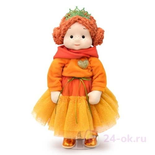 Ива — современная принцесса. Текстильная кукла с волосами из буклированной пряжи цвета оранжевой охры. Волосы заплетены в два небольших бублика. Мягкий свитшот с застежкой сзади сшит из нежного софта цвета оранжевого пламени. Спереди свитшот украшен золотистым сердечком из глиттерного материала. К свитшоту прилагается интересная деталь — объемный отстегивающийся капюшон из софта цвета оранжевой хурмы. Шикарная юбка‑пачка сшита из нескольких видов ткани. Нижняя юбка сшита из оранжевой марлевки, сверху юбка из нескольких слоев сеточки цвета красного апельсина, поверх которой нашита широкая оборка из мандариновой сеточки с золотистыми вкраплениями. Юбочка собрана на талии и украшена бантом из тонкой атласной ленты цвета травы. На ножках туфельки из эко‑кожи металлик необычного цвета оранжевого солнца. Сверху туфельки украшены красивой кристаллической брошкой. Подошва туфелек с фирменным логотипом. И завершает образ принцессы Ивы очень красивая резная диадема, выполненная вручную из фетра с переливающимися стразами.