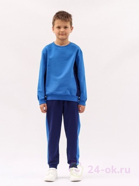 Футер, 72% хлопок, 20% полиэстер, 8% эластан / Джемпер для мальчика со спущенным плечом и длинным рукавом. Рукава с манжетами из эластичного полотна. Горловина круглая, обработана узким воротником из эластичного полотна. Нижние срезы переда и спинки обработаны притачным поясом из полотна с эластаном. Джемпер с контрастными вставками по переду, спинке и рукавам. Вставки с принтом. Спортивные брюки с контрастными вставками вдоль боковых швов и карманами. Пояс притачной из эластичного полотна. В пояс вставлена резинка. Нижние срезы брюк обработаны притачными манжетами из эластичного полотна.