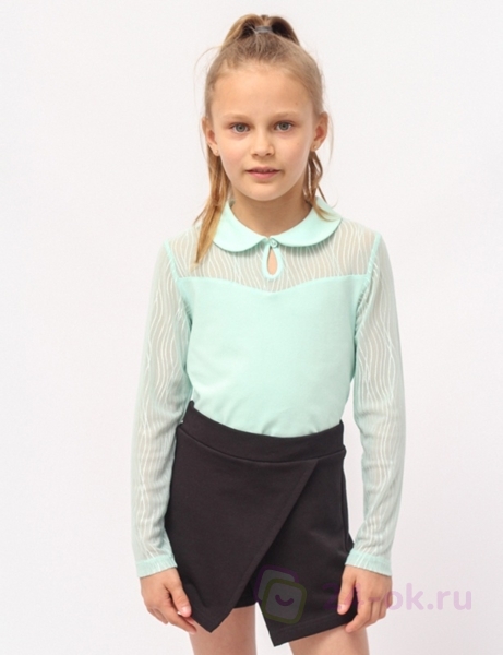 Кулирная гладь, 92% хлопок, 8% эластан; 100% полиэстер / Водолазка для девочки с короткими рукавами "фонарик". Горловина круглая, обработана воротником-стойкой. Перед водолазки с фигурной кокеткой из сетки с рисунком в верхней части.