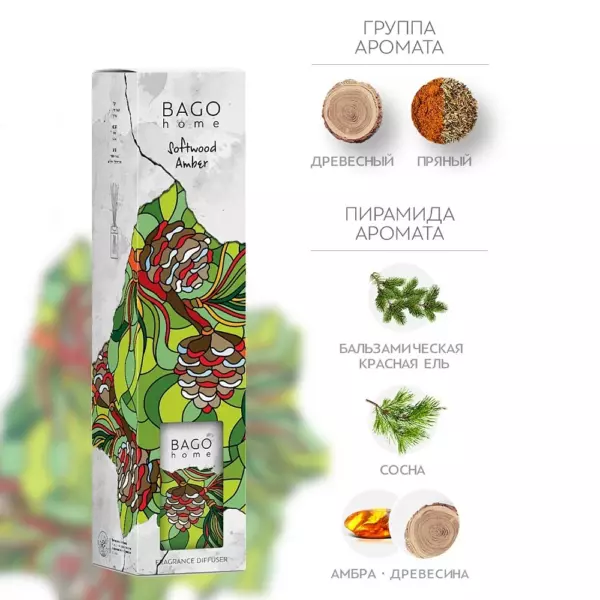 Благородное сочетание смолистого хвойного аромата еловых иголок, сосновой древесины и липких зеленых шишек, окутанное тёплым амбровым облаком. Время работы: 12-14 недель В комплекте с фибровыми палочками (6 шт.) из прессованного хлопкового волокна, которое не имеет запаха и передает аромат в чистом виде.