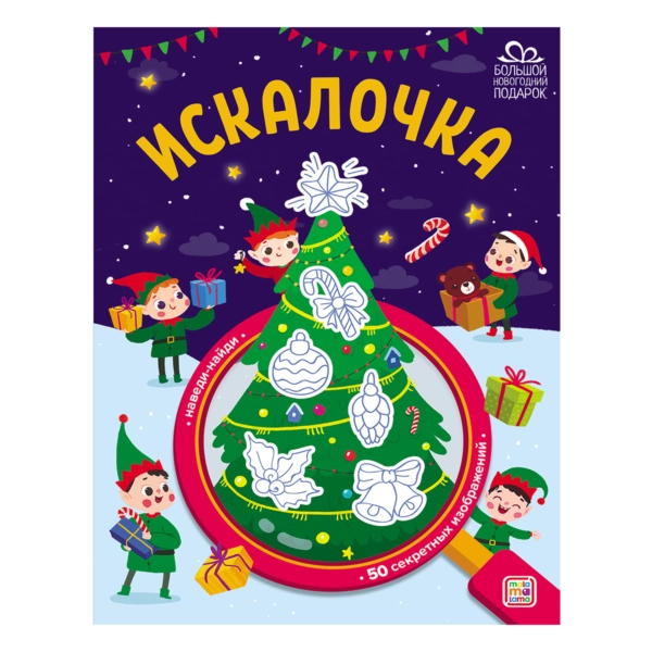 Обложка Мелованная бумага с вд-лаком, блок - бумага мелованная Искалочка - это занимательная книжка с лупой, с помощью которой можно искать предметы на специальных зашифрованных участках страниц.Рассматривая картинки, ребёнок сможет выполнять задания и находить новые детали с помощью красной лупы. Задания развивают внимательность, логику, помогают потренировать счёт. Развиваться весело вместе с Malamalama!