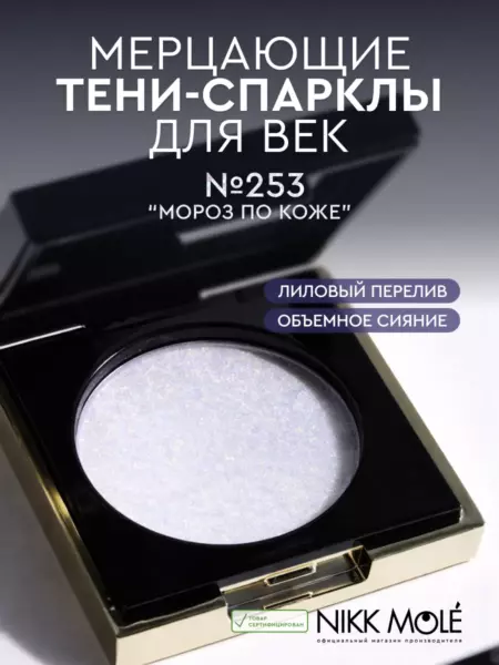 Тени-спарклы для век №253 МОРОЗ ПО КОЖЕ – хрустальный сиреневато-розовый с голубым переливом. Когда хочешь быть Снежной Королевой даже летом – величественной, прекрасной и недоступной. Самый аристократичный, поистине королевский спаркл, с которым чувствуешь себя по-другому и смотришь по-другому. Это невозможно объяснить – нужно пробовать! Подходит для макияжа в холодных или нейтральных тонах. Любую косметику на глазах превращает в премиум. Каждый спросит, что за тени у вас на глазах. ТЕКСТУРА: невероятно нежная, как будто скользящая и совершенно не сухая. Наносить на веко – особое удовольствие в макияже. УПАКОВКА: элегантные миниатюрные футляры черного цвета с золотой отделкой. Замочек надежный, но мягкий при защелкивании. Сам рефил теней на производстве защищён специальной прозрачной пластинкой, которая не позволит теням раскрошиться при транспортировке. Зеркальце в плёнке, которую легко убрать при распаковке теней. Фирменные коробочки в разных цветах – каждая отражает основной цвет спаркла внутри. Состав/Ingredients (INCI): Silica, Squalane, Poly (Dimethylsiloxane), Hydroxy Terminated, Polyisobutene, Phenyl Polytrimethylsiloxane, Isooctyl Palmitate, (Phenylsilsesquioxane)-(Dimethylsiloxane) Copolymer, Bis-Diglyceryl Polyacyladipate-2, Ethylhexylglycerin, Titanium Dioxide (CI 77891).