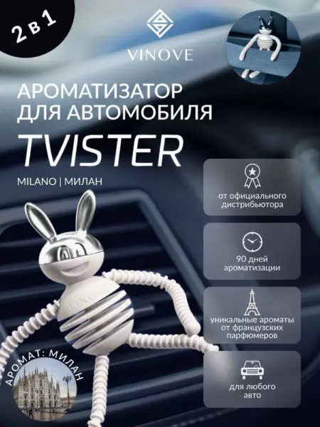 Утро у Дуомо – динамичное настроение самого модного города в мире. Свежесть мяты, терпкость специй, сладость фруктов – высокий парфюмерный стиль. Стильный дизайнерский аксессуар для вашего автомобиля по впечатляюще демократичной цене. Беспрецедентно долгий срок службы – не менее 90 дней интенсивной ароматизации достигнут за счёт использования уникального полимера, разработанного немецкими инженерами специально для бренда. Уникальный дизайн в виде забавного фантазийного героя с подвижными руками и ногами поднимает настроение одним своим видом. Великолепный аромат, созданный французскими мастерами – настоящая нишевая парфюмерия для вашего автомобиля. Утро у Дуомо – динамичное настроение самого модного города в мире. Свежесть мяты, терпкость специй, сладость фруктов – высокий парфюмерный стиль. Старт: кардамон, листья фиалки и бугенвиллия, мята, розовый перец Сердце: ананас, дыня, гибискус Шлейф: каштан, амбра, сосна, ваниль Уникальная конструкция с гнущимися во все стороны деталями позволяет зафиксировать ароматизатор в любом положении. Регулируйте интенсивность, яркость и громкость звучания аромата, изменяя температуру и скорость воздушного потока. Всё просто — чем сильнее подача и выше температура воздуха, тем ярче запах. Коллекция линии включает в себя 8 эффектных ароматов и 8 ярких цветов. Каждой парфюмерной композиции соответствует свой цвет персонажа. Применение: Прикрепите TWISTER к решетке дефлектора авто. Регулируйте насыщенность аромата с помощью изменения температуры и силы воздушного потока. Для усиления громкости звучания рекомендуется использовать горячий воздух и сильный режим обдува. TWISTER предназначен для единоразового использования. При значительном снижении интенсивности звучания замените ароматизатор на новый. Срок действия: 90 дней и более (в зависимости от интенсивности эксплуатации). Состав: EVA-термопластик, композиция аромамасел