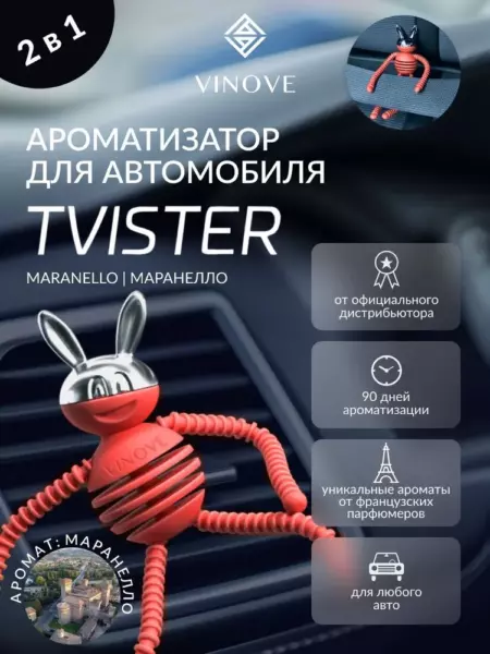 Демонстративно-позитивный, вызывающе яркий, фруктово-гурманский, сочный и громкий – а какой же ещё может быть характер у аромата, названного в честь города со штаб-квартирой FERRARI. Стильный дизайнерский аксессуар для вашего автомобиля по впечатляюще демократичной цене. Беспрецедентно долгий срок службы – не менее 90 дней интенсивной ароматизации достигнут за счёт использования уникального полимера, разработанного немецкими инженерами специально для бренда. Уникальный дизайн в виде забавного фантазийного героя с подвижными руками и ногами поднимает настроение одним своим видом. Великолепный аромат, созданный французскими мастерами – настоящая нишевая парфюмерия для вашего автомобиля. Демонстративно-позитивный, вызывающе яркий, фруктово гурманский, сочный и громкий – а какой же ещё может быть характер у аромата, названного в честь города со штаб квартирой FERRARI. Старт: перец, мандарин, груша Сердце: апельсин, жасмин Шлейф: кофе, ваниль Уникальная конструкция с гнущимися во все стороны деталями позволяет зафиксировать ароматизатор в любом положении. Регулируйте интенсивность, яркость и громкость звучания аромата, изменяя температуру и скорость воздушного потока. Всё просто — чем сильнее подача и выше температура воздуха, тем ярче запах. Коллекция линии включает в себя 8 эффектных ароматов и 8 ярких цветов. Каждой парфюмерной композиции соответствует свой цвет персонажа. Применение: Прикрепите TWISTER к решетке дефлектора авто. Регулируйте насыщенность аромата с помощью изменения температуры и силы воздушного потока. Для усиления громкости звучания рекомендуется использовать горячий воздух и сильный режим обдува. TWISTER предназначен для единоразового использования. При значительном снижении интенсивности звучания замените ароматизатор на новый. Срок действия: 90 дней и более (в зависимости от интенсивности эксплуатации). Состав: EVA-термопластик, композиция аромамасел