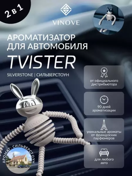 Жизнерадостность цитрусов, спокойное умиротворение древесных нот, торжес-твенное величие мускуса. Аромат не победы – триумфа! Стильный дизайнерский аксессуар для вашего автомобиля по впечатляюще демократичной цене. Беспрецедентно долгий срок службы – не менее 90 дней интенсивной ароматизации достигнут за счёт использования уникального полимера, разработанного немецкими инженерами специально для бренда. Уникальный дизайн в виде забавного фантазийного героя с подвижными руками и ногами поднимает настроение одним своим видом. Великолепный аромат, созданный французскими мастерами – настоящая нишевая парфюмерия для вашего автомобиля. Громкая древесно-цитрусовая, пронизанная энергией и динамикой, композиция SILVERSTONE названа в честь одноименной трассы Формулы I, принимающей Гран-при Великобритании на протяжении последних 70 лет. Старт: лимон, свежескошенная трава, лаванда Сердце: кедр, флердоранж Шлейф: мускус, пачули, пудровые аккорды Уникальная конструкция с гнущимися во все стороны деталями позволяет зафиксировать ароматизатор в любом положении. Регулируйте интенсивность, яркость и громкость звучания аромата, изменяя температуру и скорость воздушного потока. Всё просто — чем сильнее подача и выше температура воздуха, тем ярче запах. Коллекция линии включает в себя 8 эффектных ароматов и 8 ярких цветов. Каждой парфюмерной композиции соответствует свой цвет персонажа. Применение: Прикрепите TWISTER к решетке дефлектора авто. Регулируйте насыщенность аромата с помощью изменения температуры и силы воздушного потока. Для усиления громкости звучания рекомендуется использовать горячий воздух и сильный режим обдува. TWISTER предназначен для единоразового использования. При значительном снижении интенсивности звучания замените ароматизатор на новый. Срок действия: 90 дней и более (в зависимости от интенсивности эксплуатации). Состав: EVA-термопластик, композиция аромамасел