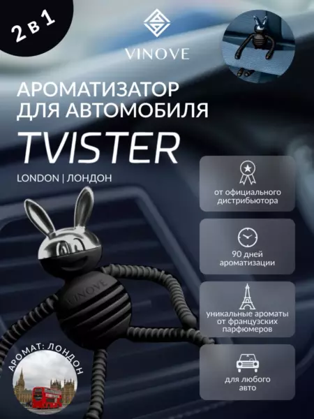 Попытка согреться после прогулки по Сити в дождь – чай с пряностями, коньяк из дубовой бочки и непередаваемая атмосфера трехсотлетнего паба. Стильный дизайнерский аксессуар для вашего автомобиля по впечатляюще демократичной цене. Беспрецедентно долгий срок службы – не менее 90 дней интенсивной ароматизации достигнут за счёт использования уникального полимера, разработанного немецкими инженерами специально для бренда. Уникальный дизайн в виде забавного фантазийного героя с подвижными руками и ногами поднимает настроение одним своим видом. Великолепный аромат, созданный французскими мастерами – настоящая нишевая парфюмерия для вашего автомобиля. Попытка согреться после прогулки по Сити в дождь – чай с пряностями, коньяк из дубовой бочки и непередаваемая атмосфера трехсотлетнего паба. Старт: ананас, какао, бобы тонка, кофе, апельсин, абрикос, лайм, орехи Сердце: цветы, специи, сухофрукты Шлейф: мед, древесные ноты, ваниль Уникальная конструкция с гнущимися во все стороны деталями позволяет зафиксировать ароматизатор в любом положении. Регулируйте интенсивность, яркость и громкость звучания аромата, изменяя температуру и скорость воздушного потока. Всё просто — чем сильнее подача и выше температура воздуха, тем ярче запах. Коллекция линии включает в себя 8 эффектных ароматов и 8 ярких цветов. Каждой парфюмерной композиции соответствует свой цвет персонажа. Применение: Прикрепите TWISTER к решетке дефлектора авто. Регулируйте насыщенность аромата с помощью изменения температуры и силы воздушного потока. Для усиления громкости звучания рекомендуется использовать горячий воздух и сильный режим обдува. TWISTER предназначен для единоразового использования. При значительном снижении интенсивности звучания замените ароматизатор на новый. Срок действия: 90 дней и более (в зависимости от интенсивности эксплуатации). Состав: EVA-термопластик, композиция аромамасел