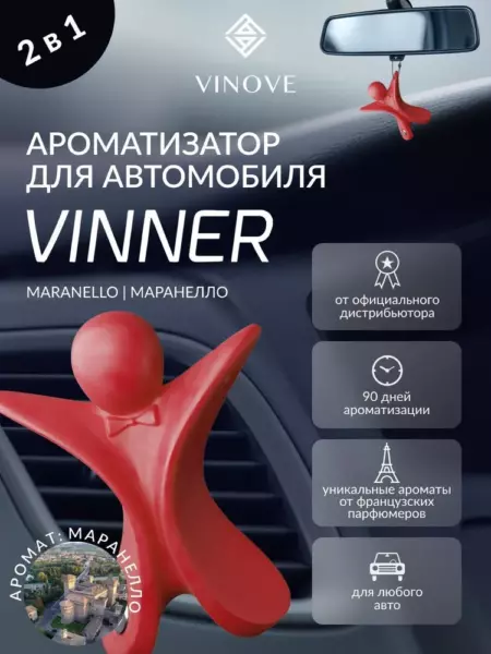 Эксклюзивный аромат от французских парфюмеров — демонстративно-позитивный, вызывающе яркий, фруктово-гурманский, сочный и громкий – а какой же ещё может быть характер у аромата, названного в честь города со штаб-квартирой FERRARI. Старт: перец, мандарин, груша Сердце: апельсин, жасмин Шлейф: кофе, ваниль Стильный дизайнерский аксессуар для вашего автомобиля по впечатляюще демократичной цене. 2 варианта размещения — на решетке дефлектора или на зеркале. В комплекте клипса для крепления и шнурок для подвешивания. Беспрецедентно долгий срок службы – не менее 90 дней интенсивной ароматизации достигнут за счёт использования уникального полимера, разработанного немецкими инженерами специально для бренда. Уникальный дизайн в виде человечка с победно поднятыми вверх руками – настоящий талисман удачи для поездок за достижениями и победами! Применение: При установке на решетку дефлектора регулируйте интенсивность, яркость и громкость звучания аромата, изменяя температуру и скорость воздушного потока. Всё просто — чем сильнее подача и выше температура воздуха, тем ярче запах. VINNER предназначен для единоразового использования. При значительном снижении интенсивности звучания замените ароматизатор на новый. Срок действия: 90 дней и более (в зависимости от интенсивности эксплуатации) Состав: EVA-термопластик, композиция аромамасел