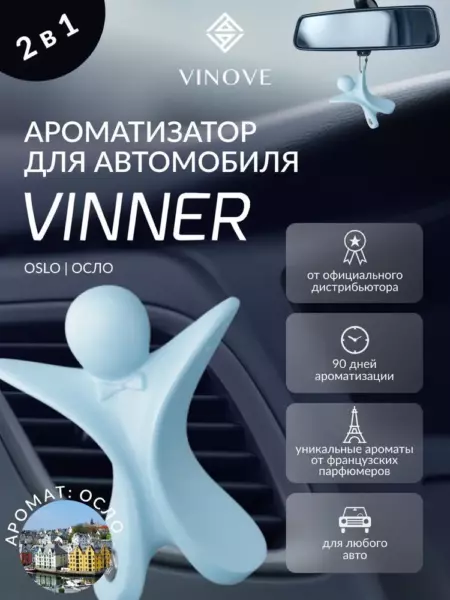 Ода природе – прогулка на яхте по норвежским фьордам. Искрящийся свежестью воздух, сочная зелень и благородный аромат деревянной палубы. Стильный дизайнерский аксессуар для вашего автомобиля по впечатляюще демократичной цене. 2 варианта размещения — на решетке дефлектора или на зеркале. В комплекте клипса для крепления и шнурок для подвешивания. Беспрецедентно долгий срок службы – не менее 90 дней интенсивной ароматизации достигнут за счёт использования уникального полимера, разработанного немецкими инженерами специально для бренда. Уникальный дизайн в виде человечка с победно поднятыми вверх руками – настоящий талисман удачи для поездок за достижениями и победами! Великолепный аромат, созданный французскими мастерами – настоящая нишевая парфюмерия для вашего автомобиля. Ода природе – прогулка на яхте по норвежским фьордам. Искрящийся свежестью воздух, сочная зелень и благородный аромат деревянной палубы. Старт: ладан, розовый перец Сердце: бензоин, ветивер, кожаные ноты Шлейф: сандал, лабданум Применение: При установке на решетку дефлектора регулируйте интенсивность, яркость и громкость звучания аромата, изменяя температуру и скорость воздушного потока. Всё просто — чем сильнее подача и выше температура воздуха, тем ярче запах. VINNER предназначен для единоразового использования. При значительном снижении интенсивности звучания замените ароматизатор на новый. Срок действия: 90 дней и более (в зависимости от интенсивности эксплуатации) Состав: EVA-термопластик, композиция аромамасел