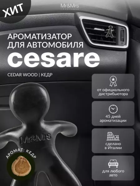 Дизайнерский ароматизатор для автомобиля CESARE CEDAR WOOD | КЕДР черный в блистере Стильный дизайнерский аксессуар для Вашего авто по впечатляюще демократичной цене! Абсолютный бестселлер бренда MR&MRS FRAGRANCE, бьющий миллионные рекорды продаж во всём мире благодаря беспрецендентному соотношению «цена-качество». Уникальный дизайн в виде стильного забавного человечка Чезаре— произведение знаменитого итальянского дизайнера Лука Трацци. Эксклюзивный аромат от парфюмеров MANE . Сложная многогранная парфюмерная композиция разработана мастерами одного из крупнейших французских парфюмерных концернов. Старт: Апельсин, Лимон, Жасмин, Роза Сердце: Розмарин, Лаванда, Шалфей, Морская нота Шлейф: Пачули, Кашмеран, Амбра Удобство использования — ароматизатор одним движением прикрепляется к решетке дефлектора авто и при необходимости так же легко и просто снимается с неё. Регулируйте интенсивность, яркость и громкость звучания аромата изменяя температуру и скорость воздушного потока. Всё просто — чем сильнее подача и выше температура воздуха, тем ярче запах. Коллекция линии включает в себя 12 ярких разноплановых композиций. 6 ароматов-бестселлеров представлены в трёх форматах – человечка, спрея и карточки. Вы можете использовать их как по отдельности, так и вместе, усиливая звучание любимого аромата. 100% MADE IN ITALY — все этапы производства продукта осуществляются в Италии. Применение: Прикрепите CESARE к решетке дефлектора авто. Регулируйте насыщенность аромата с помощью изменения температуры и силы воздушного потока. Для усиления громкости звучания рекомендуется использовать горячий воздух и сильный режим обдува. CESARE предназначен для единоразового использования. При значительном снижении интенсивности звучания замените ароматизатор на новый. Срок действия: 45 дней и более (в зависимости от интенсивности эксплуатации). Состав:EVA-термопластик, композиция аромамасел. Бренд:MR&MRS FRAGRANCE Размер:5 х 7 см
