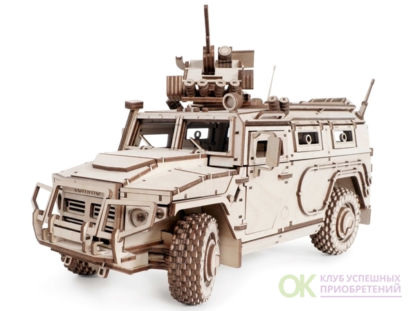 В набор входит: * Клей * Наждачная бумага * Подробная инструкция У собранной модели: открываются двери, люки стрелковой платформы на крыше, окна и капот . Вращаются и снимаются колеса, передние колеса поворачиваются, вращаются пушки . Все детали из качественной древесины. Конструктор можно раскрасить акриловыми красками! Наборы будут интересны для любых возрастов! Собирая конструктор развивается мелкая моторика! За сборкой вы получаете приятное времяпрепровождение, а готовая модель послужит не только игрушкой для Вашего ребенка, но и стильным украшением интерьера! Количество деталей: 493; Размеры готового изделия: 320x160x180 мм;