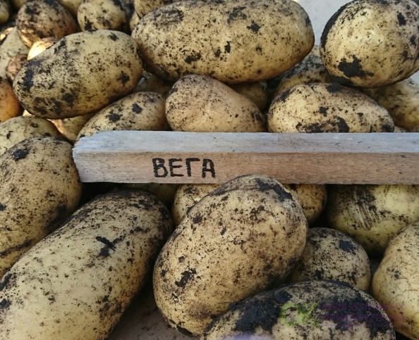 Вега – немецкий раннеспелый сорт. Период от появления полных всходов до сбора урожая - 50-65 дней, первая копка на 45-й день. В одном гнезде Веги формируется 8-10 выравненных однородных клубней, масой 85-120 гр. Клубни правильной овальной формы, с ровной поверхностью без бугров и впадин. Кожура желтой окраски. Мякоть темно-желтого цвета. Сорт - один из самых высокоурожайных сортов раннего срока созревания. У Веги отличная лежкость. Клубнеплоды могут храниться более года, при этом не теряют свой идеальный товарный вид и хороший вкус. Они не склонны к прорастанию, поэтому, при незначительных нарушениях температурного режима в хранилище, урожай не потеряет своих качеств. Вкус у Веги отменный. Сорт отнесен к кулинарному типу B (по классификации EAPR – европейской ассоциации исследования картофеля), клубни обладают средней развариваемостью, универсальны на кухне. Вега подходит для жарки, отваривания, запекания, приготовления супов и салатов, овощных смесей. Пюре из Веги получается темно-желтым, ароматным, вкусным и красивым, хотя и не таким воздушным, как из более «крахмалистого» картофеля. Мякоть не темнеет ни при варке, ни в сыром нарезанном виде. Содержание крахмала 10,1-15,9%. Сорт отлично подходит для диетического и детского питания. Вега устойчива к ризоктониозу, золотистой цистообразующей нематоде, возбудителю рака, черной ножке, вирусу Y. Средневосприимчивы к вирусу скручивания листьев и парше обыкновенной, к фитофторозу обладают высокой устойчивостью. Сорт засухоустойчив. Особенности агротехники: поскольку клубни имеют выраженный период покоя, рекомендуется перед посадкой клубни прорастить.