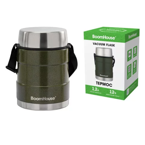 Корпус термоса BoomHouse покрыт молотковым покрытием оливкового цвета, которое не только обеспечивает термосу стильный дизайн, но и препятствует появлению мелких царапин при долгосрочном использовании. Термос снабжен удобным ремешком, регулируемым по длине. В комплекте с термосом поставляется пластиковый контейнер с крышкой. Благодаря диаметру горлышка в 10,5 см можно есть прямо из термоса.
