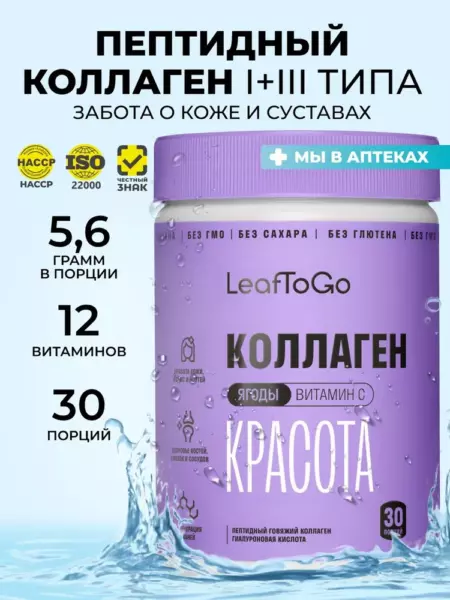 LeafToGo collagen - это натуральный продукт, созданный из высококачественного коллагена c витамином C. Попадая в организм, этот белок расщепляется на набор аминокислот и помогает коже дольше оставаться молодой и здоровой. А также поддерживает в отличном состоянии суставы, мышцы, скелет, хрящевую ткань, в несколько раз сокращается ломкость волос и ногтей. Гиалуроновая кислота - это «универсальная молекула красоты», важна для поддержания водного баланса клеток организма. Принимать коллаген нужно вместе с витамином C, который уже идет в составе. Поэтому никакие другие добавки вам не нужны. Противопоказания: индивидуальная непереносимость компонентов продукта, беременность и кормление грудью. Перед применением проконсультироваться со специалистом. Не является лекарственным средством. витамин с, коллаген гидролизованный Производитель: LeafToGo Состав: гидролизованный морской коллаген (пептидный коллаген), желатин (оболочка капсулы), гиалуроновая кислота, аскорбиновая кислота (витамин С) Преимущества: Качественный пептидный (гидролизованный) морской коллаген с гиалуроновой кислотой и витамином С; сертифицированное сырье производства Бразилии и Европы; "чистый" состав без примесей; минимальное содержание сукралозы; надежная и стильная упаковка Срок годности: 24 месяца