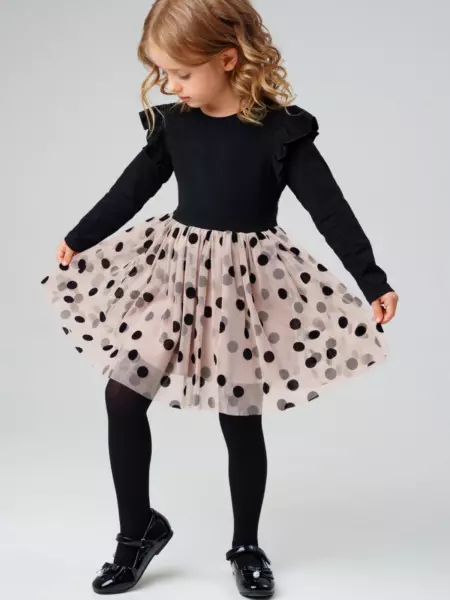 Это платье создано для тех, кто хочет выглядеть нарядно каждый день. Удобный трикотажный верх сочетается с воздушной юбкой из сетки с бархатными горошинами. Такой образ подойдёт и для праздника, и для повседневной сказки.