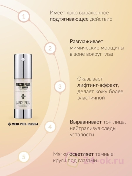 Омолаживающая пептидная сыворотка для век Medi-Peel Mezzo Filla Eye Serum обладает ярко выраженным подтягивающим действием, разглаживает мимические морщинки в области вокруг глаз и носогубных складок, обладает ревитализирующим действием и тонизирует, даёт глубокое увлажнение и мягко осветляет тёмные круги.