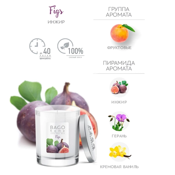 «Инжир» от BAGO home – многогранный аромат инжира от летнего и травянистого до тонкого и горьковатого, как миндаль, волшебным образом объединяются со спелой малиной и сочной клюквой. Цветочная феерия из пряной ванили, сладкой лилии и свежести герани дополняет фруктово-ягодный букет. Впустите это богатство в дом и удивите друзей!