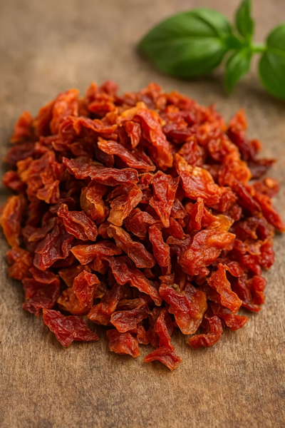Кусочки томатов от светлого красно-оранжевого до ярко-красного цвета, однородные плотные без комков. При разваривании красные. Вкус: типичный для томата, слегка кисловатый, со сладким привкусом, без горечи. Состав: 100% томат сушёный.