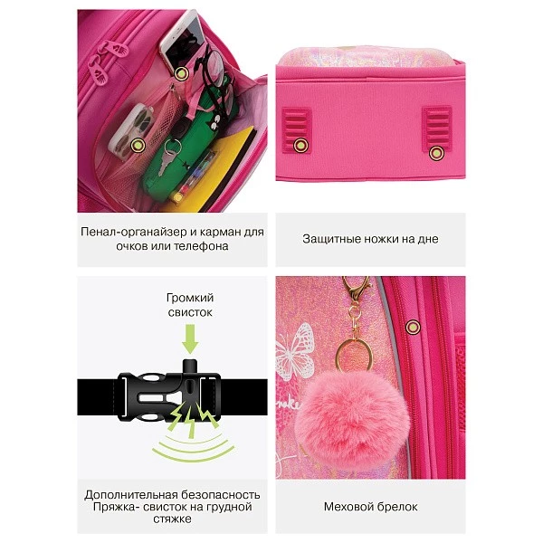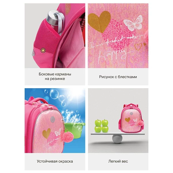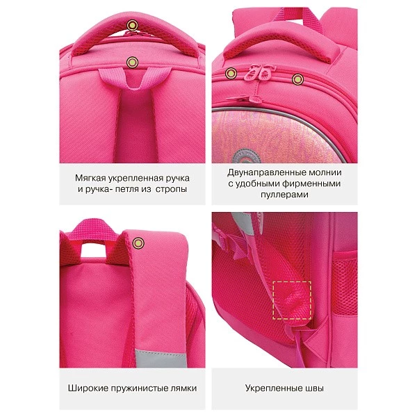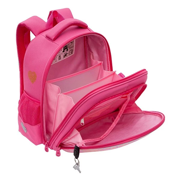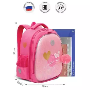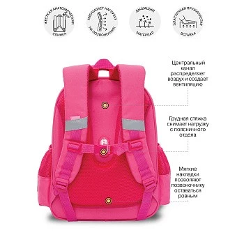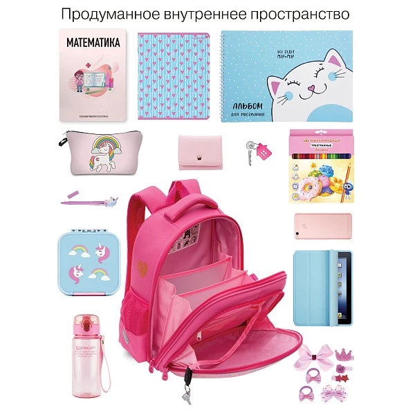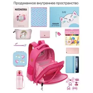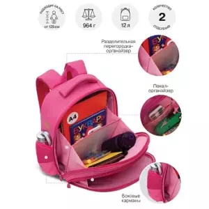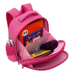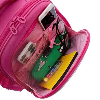 В него поместятся все школьные принадлежности. Основное отделение разбито на три отсека: для книг, тетрадей и папок А4. В дополнительное помещается сменка (есть три кармашка для мелочей). В боковых можно носить воду или перекус. Каждый предмет на своем месте. Ранец отлично подойдёт для первоклассника.
