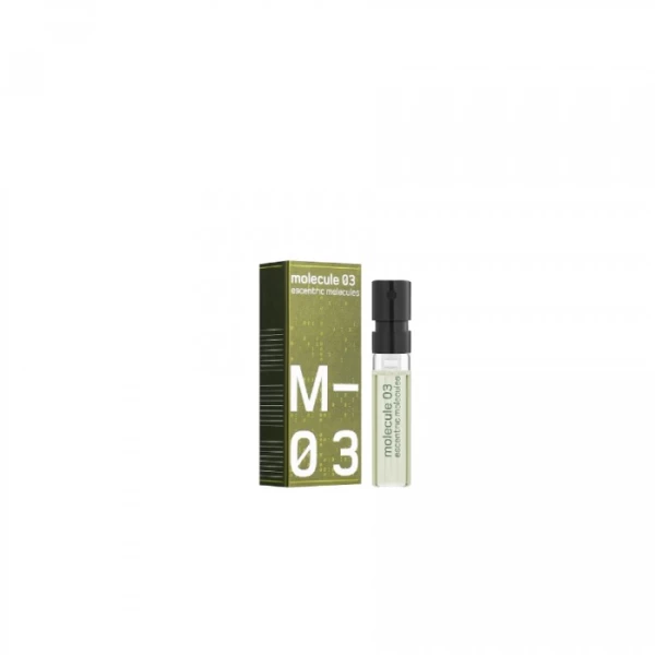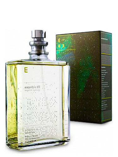 Escentric 03 Escentric Molecules — это аромат для мужчин и женщин, он принадлежит к группе шипровые. Escentric 03 выпущен в 2010 году. Парфюмер: Geza Schoen. Верхние ноты: Лайм, Имбирь и Перец; средние ноты: Чай, Ирис и Жасмин; базовые ноты: Ветивер, Вирджинский кедр, Кожа, Сандал и Мускус.