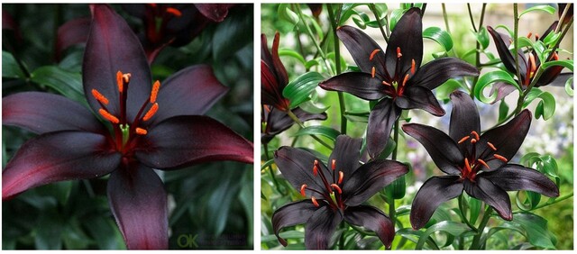 Крупные цветы темно-бордового, почти черного к середине оттенка имеют глянцевый блеск и ярко-оранжевые пыльники.