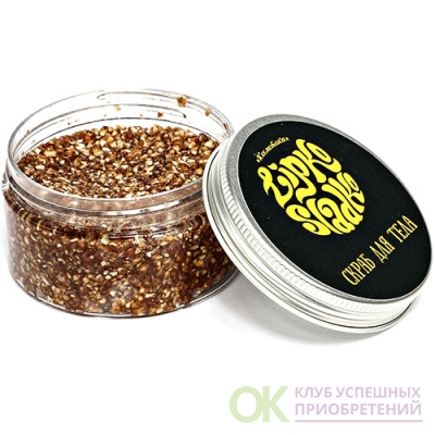 В составе скраба масла: оливковое, кокосовое, пальмовое, пальмоядровое, виноградной косточки. А также мёд , имбирь и скрабирующее вещество – измельченная гречка.