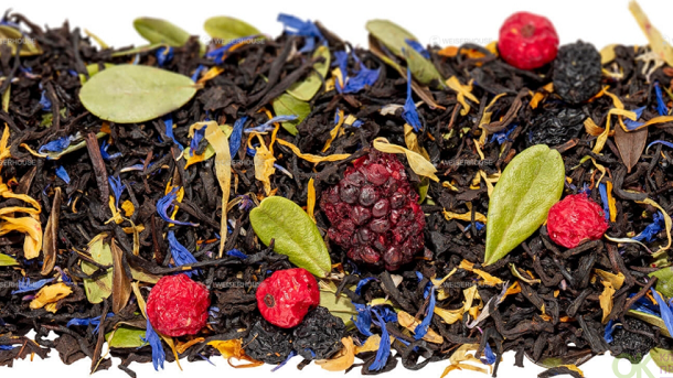 Черный цейлонский чай с добавлением ягод брусники, черноплодной рябины, цельных ягод ежевики, лепестков календулы, василька и брусничного листа