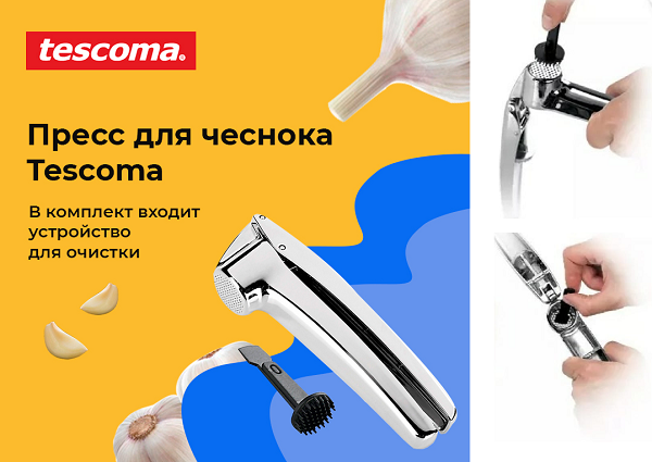 Чеснокодавка Tescoma PRESIDENT изготовлена из первоклассной нержавеющей стали и прочной пластмассы.