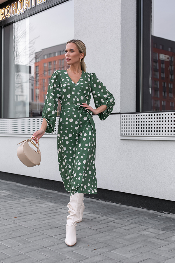 ✔️Платье с запахом фиксирующимся притачным поясом выполнено из плательной ткани. Отрезное в области талии. Лиф прилегающий. Юбка летящего силуэта. Фантазийные рукава с асимметричным низом, окантованным бейкой, и сборкой по окату и низу рукава.