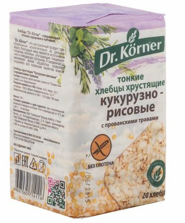 Изысканное сочетание кукурузы, риса и прованских трав придают хлебцам Dr.Korner необыкновенный вкус! 100% натуральный продукт. Только цельные злаки. Источник пищевых волокон. Не содержит пшеницу и муку. Без глютена. Без ГМО. Состав: кукуруза, крупа рисовая, пряности "Прованские травы", соль йодированная.