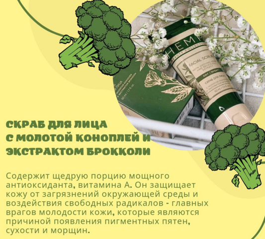 🥦Мягкий скраб с молотой коноплей и экстрактом брокколи способствует бережному очищению кожи от ороговевших клеток.