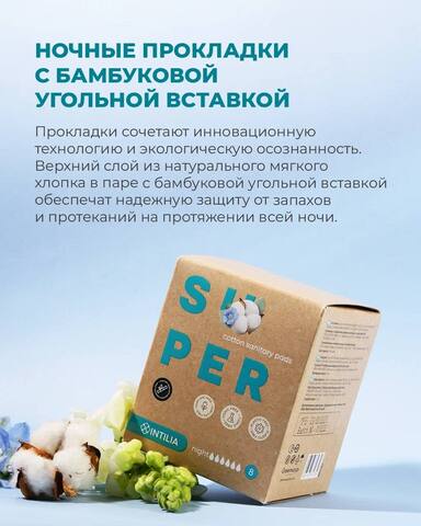 ✅Бамбуковый уголь эффективно впитывает влагу и неприятные запахи. Прокладки особенно подходят для использования во время сна