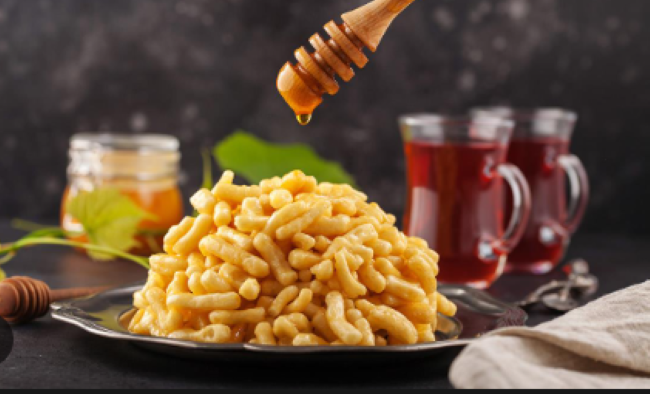 6.В казане, глубокой сковороде или кастрюле с толстым дном нагреть масло. Опустить палочки в кипящий жир. Жарить, помешивая, до золотистого цвета (2-3 минуты). Затем палочки вынуть из жира. Точно также жарить остальные порции теста. По мере необходимости доливать в казан масло.
