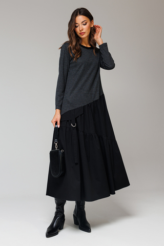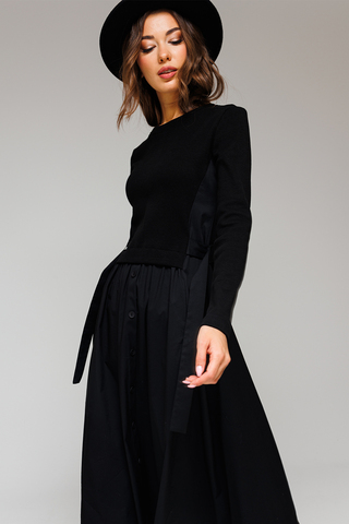 Платье полуприлегающего силуэта, отрезное по линии талии, комбинированное из трикотажа и текстиля.