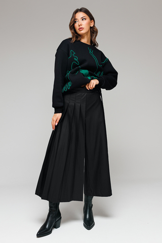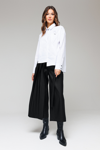 Брюки расширенного силуэта на притачном поясе, с застежкой на потайную тесьму-молнию в боковом шве.