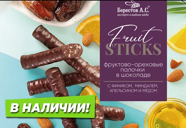 Fruit Stiсks с финиками, отборным миндалём и сочным апельсином, покрытые натуральным шоколадом - полезные и натуральные конфеты к чаю или к кофе. В составе помимо фруктов и орехов присутствует натуральный мед, который вносится "холодным методом", сохраняя при этом все полезные свойства. Попробуйте эти необычные и полезные конфеты, угостите близких!