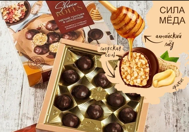 ShocoRolls с солёным арахисом и мёдом в красивой подарочной упаковке! Необычный вкус - сочетание обжаренного арахиса, ароматного алтайского мёда с щепоткой морской соли в превосходной бельгийской шоколадной глазури! Конфеты полезны и заряжают энергией!