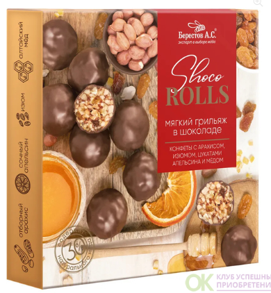Натуральный мед, изюм, арахис жареный, апельсина цукаты, шоколад темный - это всё Shoco Rolls. Ручная работа - идеально обжаренный арахис в сочетании с цедрой апельсина и белым вяленым виноградом может быть превосходным подарком, а может быть приятными минутами домашнего вечера. Попробуйте и не пожалеете.