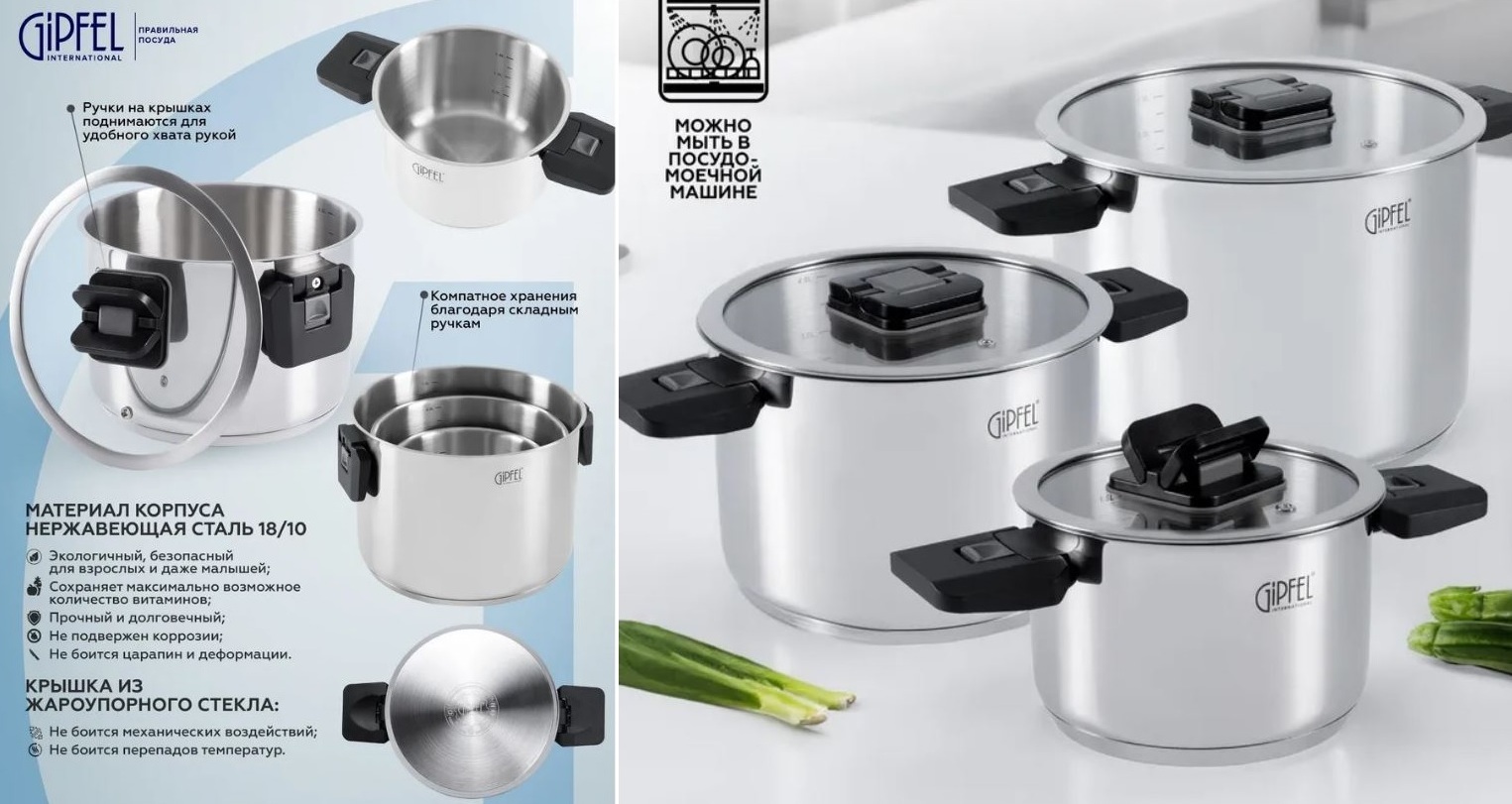 - Ручки складные, поэтому кастрюли можно ставить одну в другую и компактно хранить!