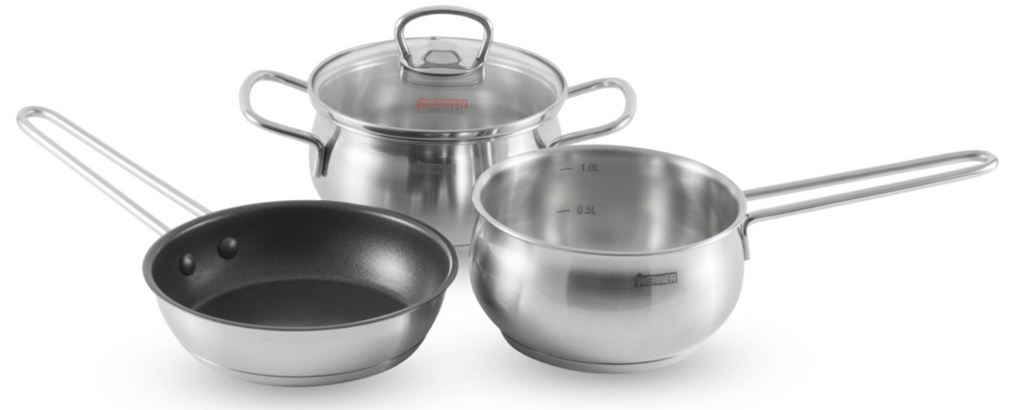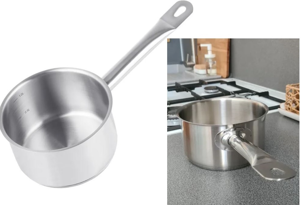 Набор достаточно компактен – объем кастрюли и ковша составляет 1,2 л, а диаметр сковороды – всего 16 см. Кастрюля и ковш имеют шкалу до 1 литра.